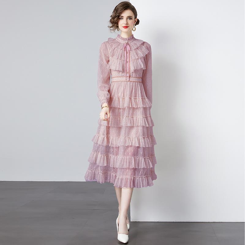 ・カテゴリ: ワンピース・主な素材: ポリエステル・主な素材混率: 30%以下・柄: 無地・装飾: リボン・スタイル: エレガント・スカート丈: ミディ丈・スカートの形: ティアードスカート・ネックライン: フリルネック・袖の形: パフスリーブ・袖丈: 長袖・前開き: ファスナー・カラー展開: ピンク、アプリコット・サイズ展開: S、M、L、XL、XXL