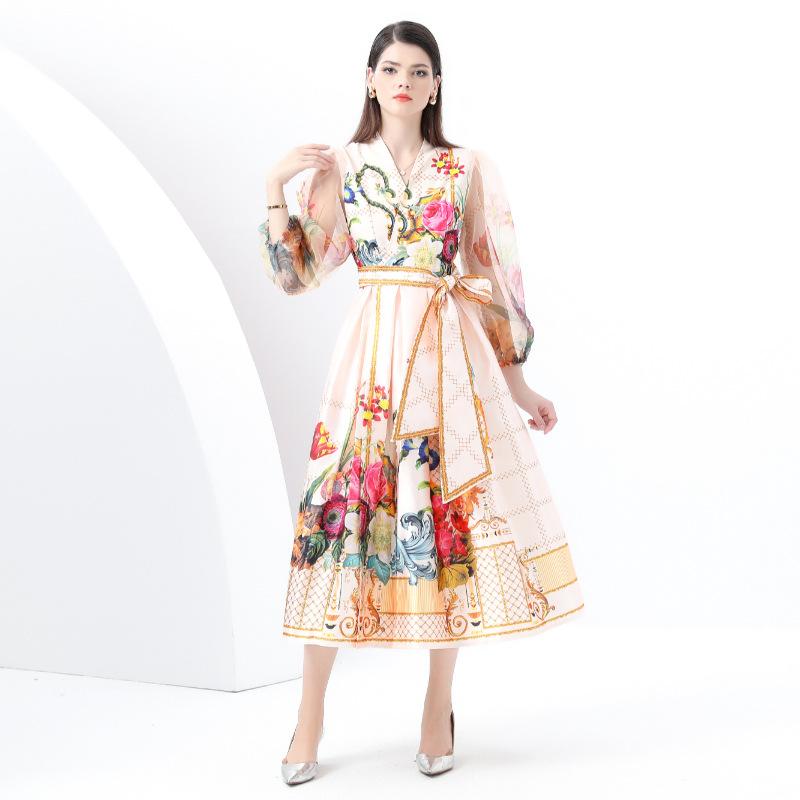 ワンピース ドレス レディース リゾート ラップデザイン ウエストリボン Vネック ランタンスリーブ ロング丈 マキシ丈 レトロ柄 プリント TR素材 上品 アプリコット ベージュ系