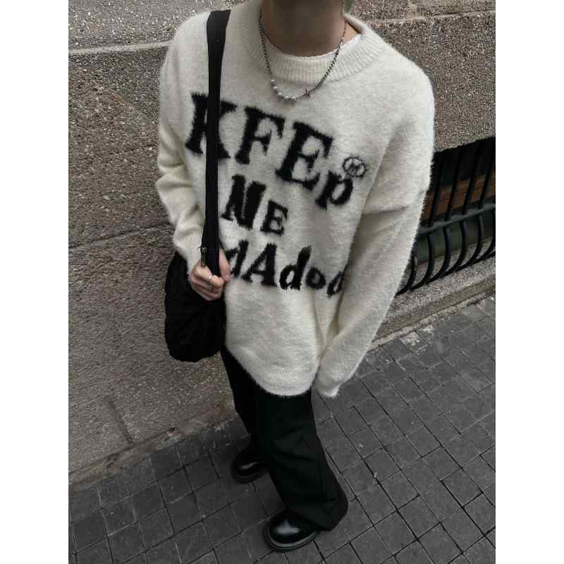 ニット メンズ マフラー 秋冬 男女兼用 モヘア風 ふわふわ セーター クルーネック 長袖 プルオーバー トップス 暖かい ゆったり カジュアル ブラック アプリコット