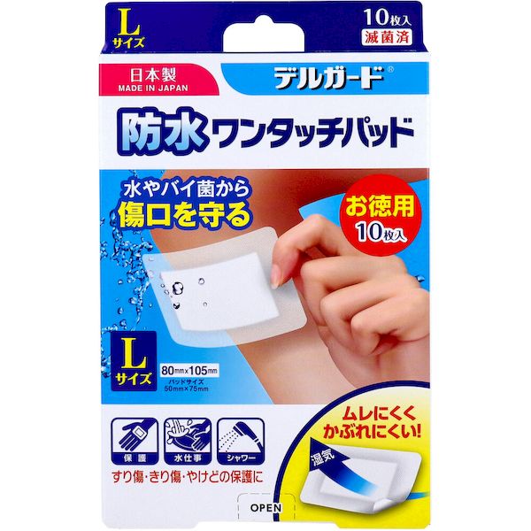 よく一緒に購入されている商品トラスコ中山 TRUSCO GS-56M 浮遊1,079円アーテック ArTec 076394 非常用ア150円【商品説明】【一般医療機器】救急絆創膏医療機器届出番号:43B2X00007W00005販売名:防水ワンタッチパッド【サイズ】Lサイズ:80mm×105mm(パッドサイズ:50mm×75mm)【使用目的又は効果】創傷面の保護【使用方法等】・患部とその周辺を清潔にし、パッドに触れないようにして、セパレータをはぎ取り、パッドを患部に当てて粘着部分で皮膚に固定してください。・パッド部分に薬を塗って患部に当てることもできます。【保管方法及び有効期間等】・小児の手の届かない所に保管してください。・直射日光の当たらない、湿気の少ない涼しい所に保管してください。ムレにくくかぶれにくい!●ワンタッチで傷口を水やバイ菌の侵入から防ぎます。●1枚ずつ滅菌包装していますので、衛生的に安心してご使用できます。●絆創膏感覚で、簡単・手軽に貼付できます。●防水粘着シートは透湿性があり、かぶれの少ないアクリル系の粘着剤を使用しています。●すり傷・きり傷・やけどの保護に。【使用上の注意】・使用は1回限り。・湿疹、かぶれ等のある場所には使用しないでください。・皮膚の弱い人、お肌に合わない人は使用しないでください。・防水目的の使用後(お風呂、シャワー、水仕事、プール等の後)は、すみやかに取りはずしてください。・パッド部分が濡れたり、又は汚れたまま放置すると傷の治りが悪くなりますので貼り替えてください。・患部に粘着面を貼らないでください。・滅菌済みですので、個装袋を破損しないようにご注意ください。また、個装袋を開いたものはすぐにお使いください。・本品の使用により、発疹・発赤、かゆみ、かぶれ等の症状があらわれた場合には、使用を中止し、医師、薬剤師又は登録販売者にご相談ください。・再使用禁止。類似商品はこちら4970883011928 デルガード 防水ワ835円4970883011935 デルガード 防水ワ835円4970883006245 デルガード ワンタ766円4987603464568 白十字 ファミリー952円4987603464551 白十字 ファミリー952円4987603464544 白十字 ファミリー952円4970883858349 デルガード 防水パ458円4987603464391 白十字 ファミリー952円4987603464520 白十字 ファミリー922円4987603464377 白十字 ファミリー922円4970883858332 デルガード 防水パ458円4970883013212 デルガード 傷あて522円