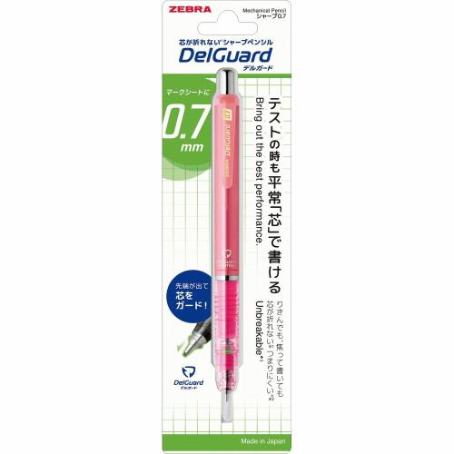 ゼブラ シャープペン デルガード 0.5mm ピンク P-MA85-N2-P【デルガード】もう折れない。デルガードシステムは、あらゆる方向から芯を守る【特長】芯が折れない(芯が出ていない状態から、4回以上ノックして書いた場合、折れることがあります)【芯径】0.5mm【本体サイズ】最大軸径10.3×137.3mm/重量10.g【軸素材】樹脂複数店舗にて販売をしておりますため、在庫データの更新が間に合わず、欠品にも関わらず、注文ができる場合がございます。その際は、キャンセルにて対応を取らせていただきます。当店はお電話のお問い合わせはお受けしておりませんので、ご了承ください。お問い合わせは、問い合わせフォームにてお願いをいたします。