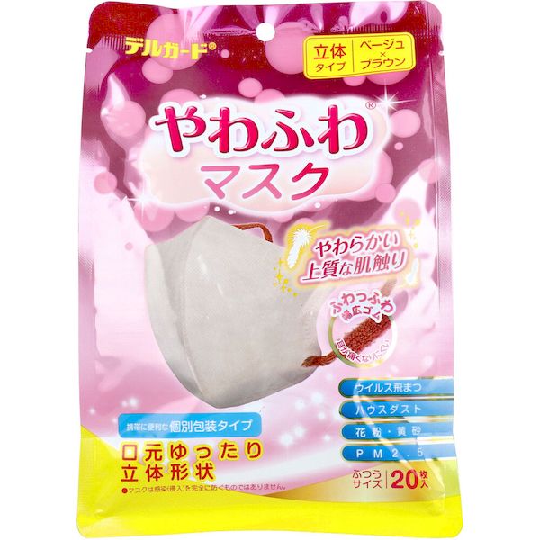 【商品説明】個装サイズ:152X225X80mm個装重量:約87g内容量:20枚入製造国:中国【品名】やわふわマスク 立体 ベージュ×ブラウン【サイズ】ふつうサイズ(フリーサイズ):約110mm×140mm【素材】本体・フィルター部:ポリプロピレン耳部:ポリエステル、ポリウレタン【ご使用方法】(1)マスク上下を確認して、左右に広げます。※マスク下部の「mask」の文字を下にしてください。(2)耳ゴム部分を伸ばし、両耳にかけます。(3)マスクの位置を調整し、隙間がないよう着用してください。ふわっふわ幅広ゴム。耳が痛くなりにくい。●口元ゆったり立体形状。口元に空間ができ、呼吸がしやすい構造です。●6mm幅広ゴム。長時間使用しても耳が痛くなりにくい「幅広耳ゴム」を採用しています。●携帯に便利な個別包装タイプ。●ウイルス飛まつ・ハウスダスト・花粉・黄砂・PM2.5。【使用上の注意】・有害な粉塵やガス等を発生する場所やそれを防ぐ目的での使用をしないでください。・かゆみ、かぶれ、発疹等が生じた場合は、直ちに使用を中止してください。・マスクの臭いで気分が悪くなった場合は、使用を中止してください。・本品は使い切り商品ですので、洗たくによる再使用はできません。・金属は使用しておりません。・火気のそばでのご使用はおやめください。・マスクは感染(侵入)を完全に防ぐものではありません。★保管上の注意・湿気のない清潔な所に保管してください。・乳幼児の手の届かない所に保管してください。類似商品はこちら4970883014707 デルガード やわふ399円4970883014097 デルガード やわふ902円4902407581358 快適ガードマスク 1,159円4571569480221 纏 MATOI マ402円4902407582379 ビースタイル 立体241円4589596694443 3D立体マスク ス276円4589596694306 3D立体マスク ス536円4589596694481 3D立体マスク ス276円4589596694504 3D立体マスク ス276円4589596694351 3D立体マスク ス517円4589596694429 3D立体マスク ス517円4903111588602 ソフトーク 超立体1,543円