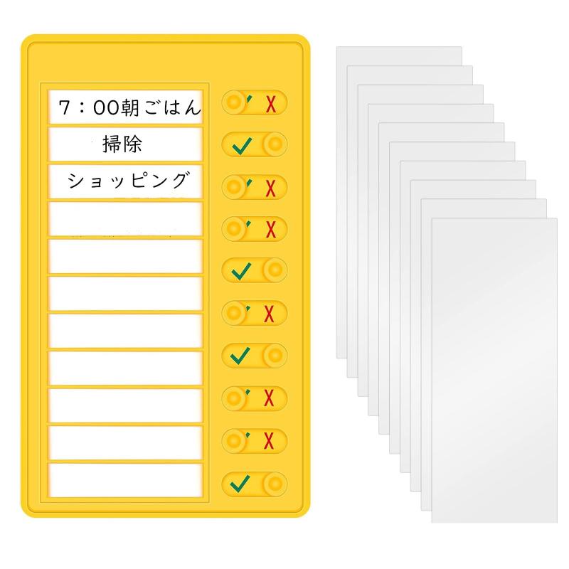 チェックリスト TO DO リスト 持ち物チェッカー ブランクカード10枚付き 忘れ物チェッカー 日常生活計画 雑用チャート メモ帳 スケジュール 項目 メモ 仕事 時間管理ノート (イエロー)【材質】丈夫で耐久性のあるプラスチック材質で作られて、何度も再利用可能で、長期間使用でき、紙の無駄を減少できます。【持ち運びに便利&再利用可能】サイズは20x 12cm、重さは約100g、小さくて軽く、使いやすいです。取り外し可能なデザインで、再利用でき、いつでも必要なメモに変更でき、非常に便利で持ち運びに便利です。【使いやすい】このTo-Doリストボードは、タスクが完了したときにスライドできる10個のスライダーで設計されており、マークを消去する必要がなく、簡単に使用できます。【良い習慣を養う】良い習慣を養うために、1日を通してやるべきことのリストを作成したり、時間を計画したり、1日の時間を最大限に活用したり、効率を向上させたりすることが可能です。【幅広い用途】家庭、オフィス、遠足、寮、休暇などに幅広く使われています。