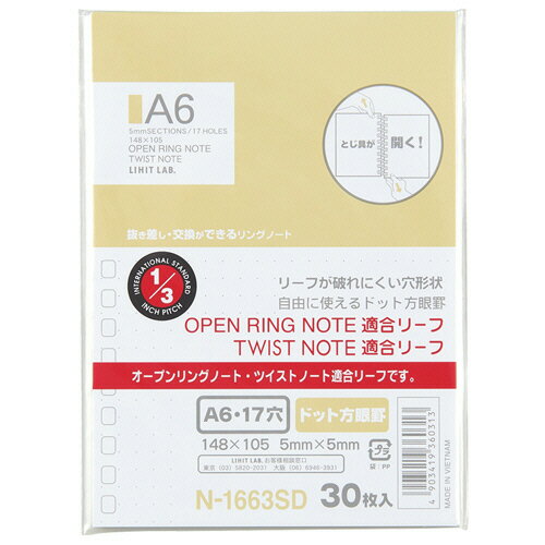 ●抜き差し・交換ができるリングノート用のリーフ、A6タテ・5mm方眼罫です。●縦横自由に使える5mm感覚のドット方眼罫。●リーフが破れにくい穴形状。●サイズ/A6タテ●寸法/タテ148×ヨコ105mm●罫/ドット方眼●罫幅/5mm●材質/上質紙●穴数/17穴●1パック=30枚●メーカー/リヒトラブ●型番/N-1663SD●JANコード/4903419360313※メーカー都合によりパッケージ・仕様等が予告なく変更される場合がございます。ご了承ください。本商品は自社サイトでも販売しているため、ご注文のタイミングにより、発送までにお時間をいただいたり、やむをえずキャンセルさせていただく場合がございます。※沖縄へのお届けは別途1650円(税込)の送料がかかります。※本商品はメーカーより取寄せ後の発送となるため、配送日はご指定頂けません(お届けするまでに3〜10営業日程度かかります。品切れなどの理由で遅れる場合は弊社よりご連絡します)。また、ご注文後のキャンセル・返品はお受けできません。予めご了承ください。