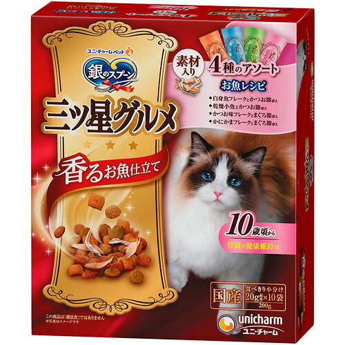 【お取寄せ品】 ユニ・チャーム 銀のスプーン 三ツ星グルメ 香るお魚仕立て 腎臓の健康維持用 10歳頃から お魚レシピ 4種アソート 200g(20g×10袋) 1箱