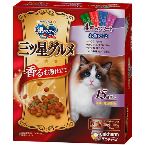 【お取寄せ品】 ユニ・チャーム 銀のスプーン 三ツ星グルメ 香るお魚仕立て 腎臓の健康維持用 15歳頃から お魚レシピ 4種アソート 200g(20g×10袋) 1箱