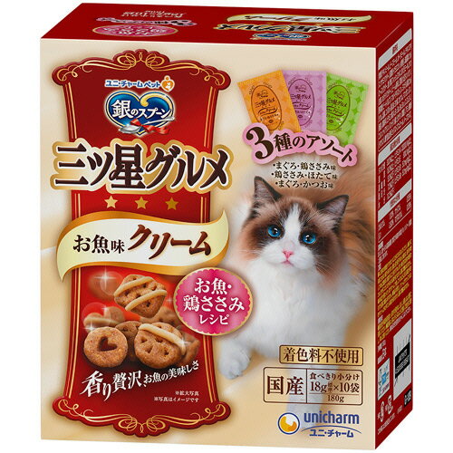 【お取寄せ品】 ユニ・チャーム 銀のスプーン 三ツ星グルメ お魚味クリーム お魚・鶏ささみレシピ 3種アソート 180g(18g×10袋) 1箱