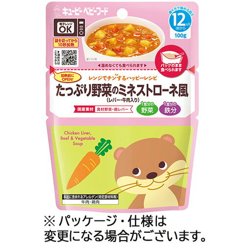 ●1食分の野菜を牛肉、鶏レバーと一緒に煮込み、ミネストローネ風に仕上げました。8パックセット。●内容量/100g●種類/たっぷり野菜のミネストローネ風●月齢/12ヵ月頃から●栄養成分/エネルギー/45kcal、たんぱく質/1.3g、脂質/0.9g、炭水化物/7.9g、食塩相当量/0.4g、鉄/1.5mg●原材料/[原材料]野菜(じゃがいも(国産)、にんじん、たまねぎ)、炒めたまねぎ、トマトペースト、コーンスターチ、トマトケチャップ、牛そぼろ、鶏レバーそぼろ、砂糖、食塩 [添加物]ピロリン酸鉄●表示すべきアレルギー項目/牛肉・鶏肉●賞味期限/商品の発送時点で、賞味期限まで残り190日以上の商品をお届けします。●開封前保存方法/直射日光を避け、常温で保存してください。●1セット=8パック※栄養成分は1パックあたり※メーカー都合により、パッケージデザインおよび仕様が変更になる場合がございます。●メーカー/キユーピー●型番/62659●JANコード/4901577086854※商品はネストローネ風 (レバー・牛肉入り)になります。※メーカー都合によりパッケージ・仕様等が予告なく変更される場合がございます。ご了承ください。本商品は自社サイトでも販売しているため、ご注文のタイミングにより、発送までにお時間をいただいたり、やむをえずキャンセルさせていただく場合がございます。※沖縄へのお届けは別途1650円(税込)の送料がかかります。