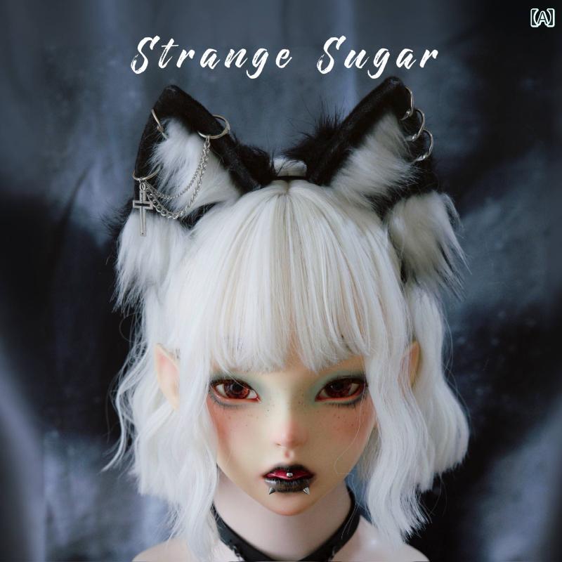 ヘアアクセサリー 黒 白 オオカミ 犬 耳 カチューシャ 猫耳 クール サブカルチャー ダーク ブラック コスプレ コスチューム 動物 衣装 装飾 リアル 毛並み シルバー チェーン ピアス 小物