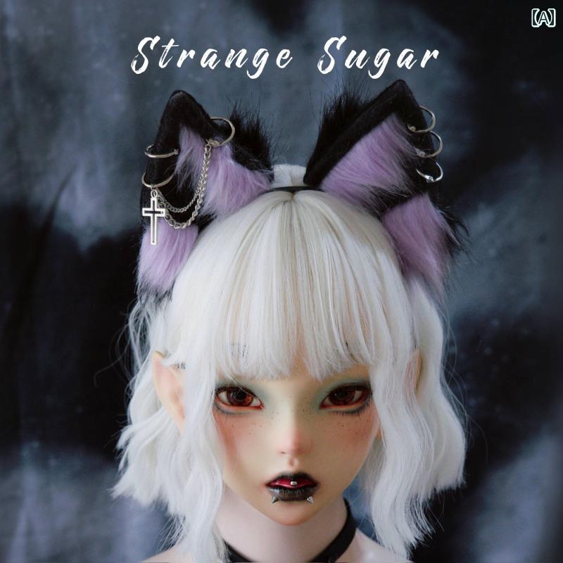 ヘアアクセサリー 黒 紫 オオカミ 犬 耳 カチューシャ 猫耳 クール サブカルチャー ダーク ブラック コスプレ コスチューム 動物 衣装 リアル 毛並み パープル シルバー チェーン ピアス