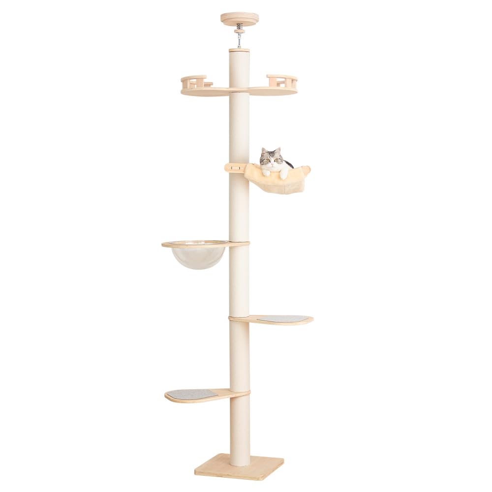 PETTIFUL キャットタワー 突っ張り 木製 大型猫 コットン紐 スリム 木登り 多頭飼い キャットツリー シニア 据え置き 太い支柱 猫タワー 中型 猫キャットタワー おしゃれ コンパクト 省スベース 木製 宇宙船 隠れ家 爪とぎ 安定 高さ203~