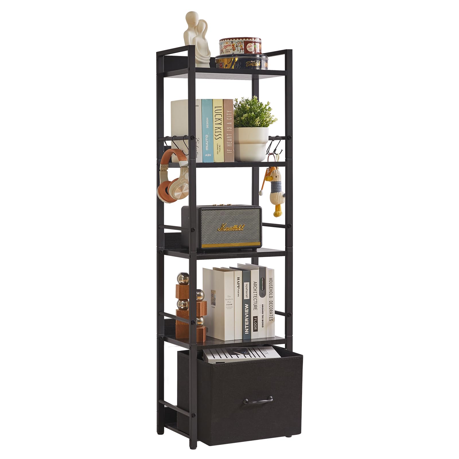 ・省スペース: このスリムな本棚には5つの棚があります。コンパクトで大容量な設計なので、床面積をあまりとりません。このおしゃれ本棚を使って、お気に入りの本、工芸品、写真アルバム、鉢植えなどを置くことができます。必需品や装飾品の保管や展示に最適です・布製引き出し付き棚: この5段スリム本棚には取り外し可能な引き出しが付いており、表面は軽くて柔らかい布製です。この設計は安全性を高め、2段から4段の棚にマッチする保育園での使用に適しています。引き出しのサイズは幅35.5x奥行き24.5x高さ27.8cmで、小さな収納ボックスと同じで、どこにでも置くことができて、クローゼットの中に自由に保管することができます・多用途とマルチカラー: この5段棚は3色から選択できるので、ご自宅で自由に組み合わせて、生活空間をカスタマイズできます。この棚は、ディスプレイ棚、オフィス本棚、植物スタンド、収納棚として使用でき、子供用本棚、机上整理棚、シューズラック、キッチンラックとしても適しています。リビングルーム、寝室、ホームオフィス、バスルーム、キッチン、玄関の装飾に最適です・安定して頑丈:オープンシェルフは高品質のパーティクルボードと耐久性のある金属フレームで作られ、安全背板、4つの調節可能な足部と転倒防止キットを備え、耐久性と安定性を高めた。各物置棚荷重15 kg、日常的なニーズに対応します・使いやすい:この棚ラックは取り付けやすく、分解も容易で、軽量で、移動や引っ越しに便利です。布の引き出しが1つ付いていて、物を分類して収納しやすく、部屋を清潔に保つことができます。また、6つのフックが付属しており、かばん、イヤホン、鍵、皮むき器と栓抜きなどの小物を収納できます