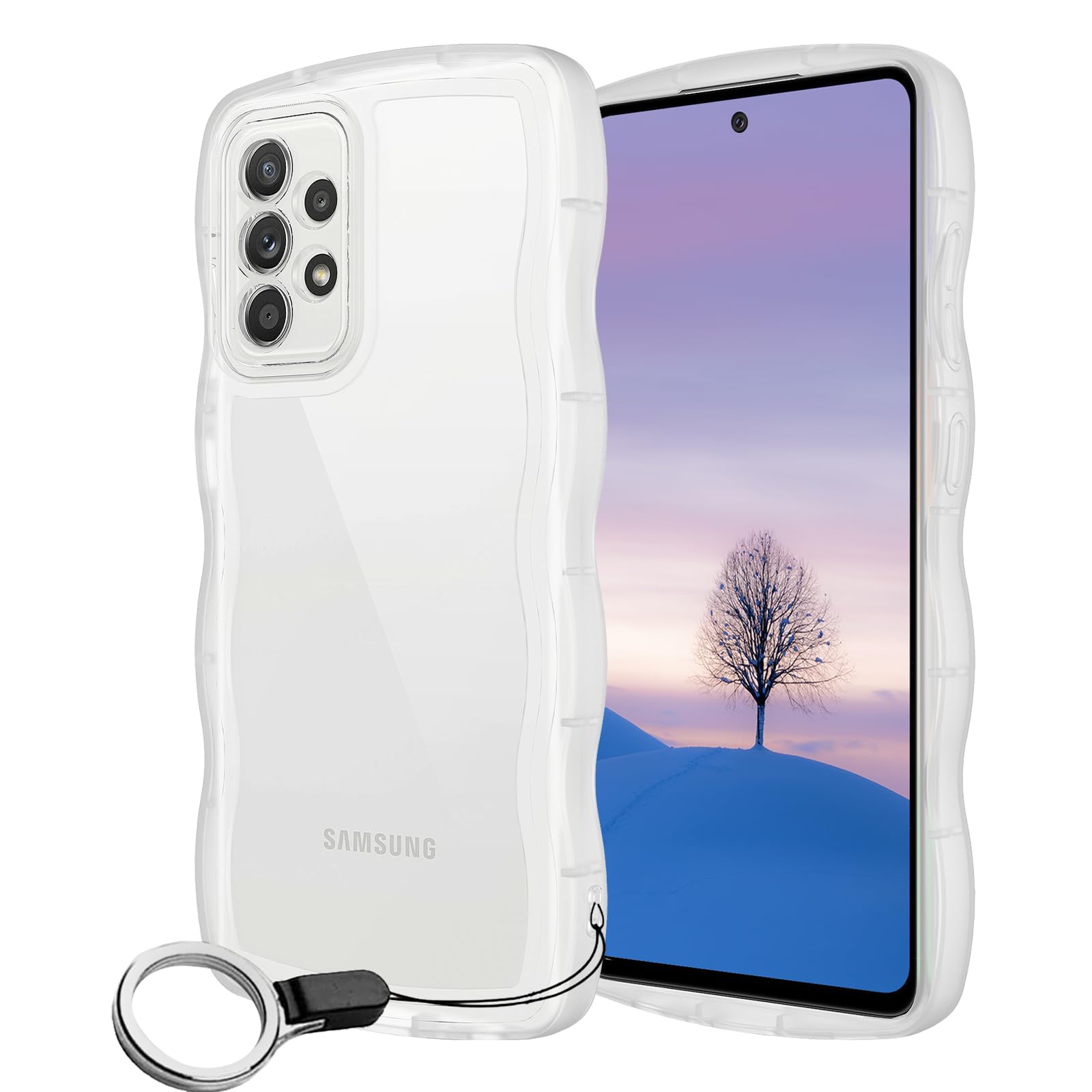 ・★【対応電話モデル】Galaxy A53 5G スマートフォン専用保護カバー。ご注文を確認する前に、必ずお手持ちの機種と選択した機種をご確認ください。・★【こだわりのウェーブ湾曲設計】このキュートなウェーブエッジデザインのケースがA53の良さをそのままに、美しいA53本来のデザインを保ちます。薄型で軽いデザインで、A53専用にデザインされ、ぴったりとフィットするケースで手にも心地よくフィットします、長く持っても疲れる感じもなく。・★【高品質TPU素材】背面はドイツ製柔らかいTPU原材料を使用し、特殊加工により高い透明度を実現。手になじみやすく、手から滑り落ちないです。また、この素材を使用しているため、指紋つく心配も全然ありません。油や指紋など付いても洗剤で洗って簡単に取れます。・★【多機能のリング付き】360°回転可能リングホルダーです。片手で携帯を操作でき、滑り止め、強奪、落下などのことを防げます。リング.ホルダーの機能は携帯を横に放置できて、いつでもどこでも音楽、映画などの娯楽番組を思い切り楽しめます。・★【耐衝撃性能】衝撃に強く、耐久性に優れた、傷がつきにくいポリカーボネート素材を採用しております。高耐衝撃構造で作られ、熟練の技術に裏付けられたクッション加工、コンクリート・砂利に落としても、落下衝撃を全方位吸収し、期待に裏切らない頑丈さを持つ。★また、右下にはストラップホールがあり、お好きなストラップを付けられます。Galaxy A53 5G ケース クリア ウェーブ TPU波状のバンパー 透明 スマホケース かわいい うねうね ギャラクシー A53 ウェーブ デザイン 可愛い 韓国 女性用 薄型 人気 おしゃれ 耐衝撃 Galaxy A53 5G ストラップホール付き(Galaxy A53 5G-クリア)