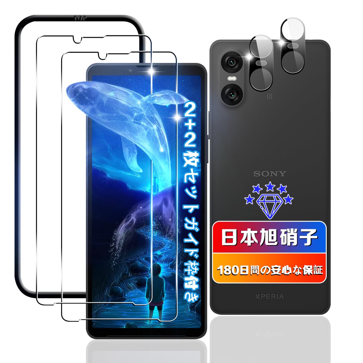 【 2+2枚セット】 対応 Xperia 10 VI ガラスフィルム 2枚+ レンズフィルム 2枚 【日本旭硝子素材採用 ガイド枠付き 】 対応 エクスペリア10 VI フィルム 強化ガラス 液晶 Xperia 10VI 保護フィルム ケース カバー 超薄