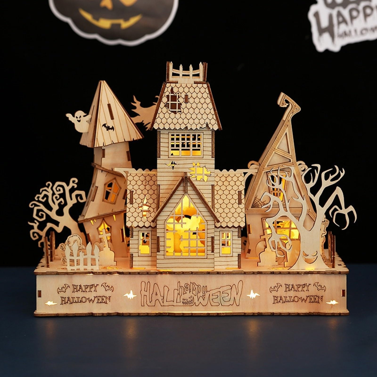 Hallisun 3D木製パズル DIYハロウィンハウス LEDライト付き 模型 組み立てキット 立体パズル 頭の体操 ホビーゲーム おもちゃ 大人 向け 14歳+ DIY手芸 機械ミニチュア 誕生日 ハロウィン Halloween 家族 友人プレゼント