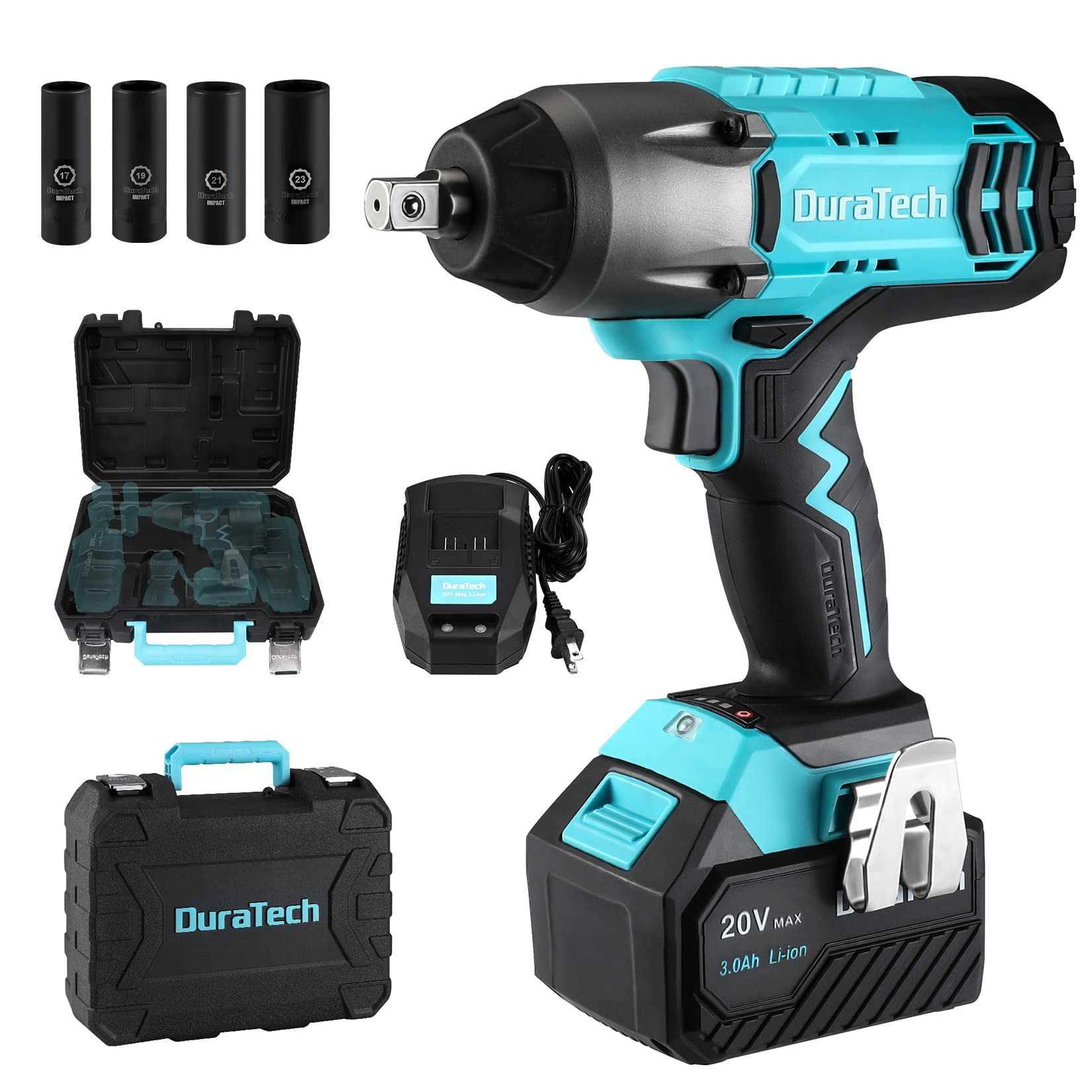 DURATECH インパクトレンチ 電動インパクトレンチ 20V 充電式 コードレス LEDライト付き 無段変速 自動停止モード 正逆切替 最大トルク450N.m ディープソケット4本付き 大容量バッテリー・充電器付 タイヤ交換 自動車の修理 ホームメンテ