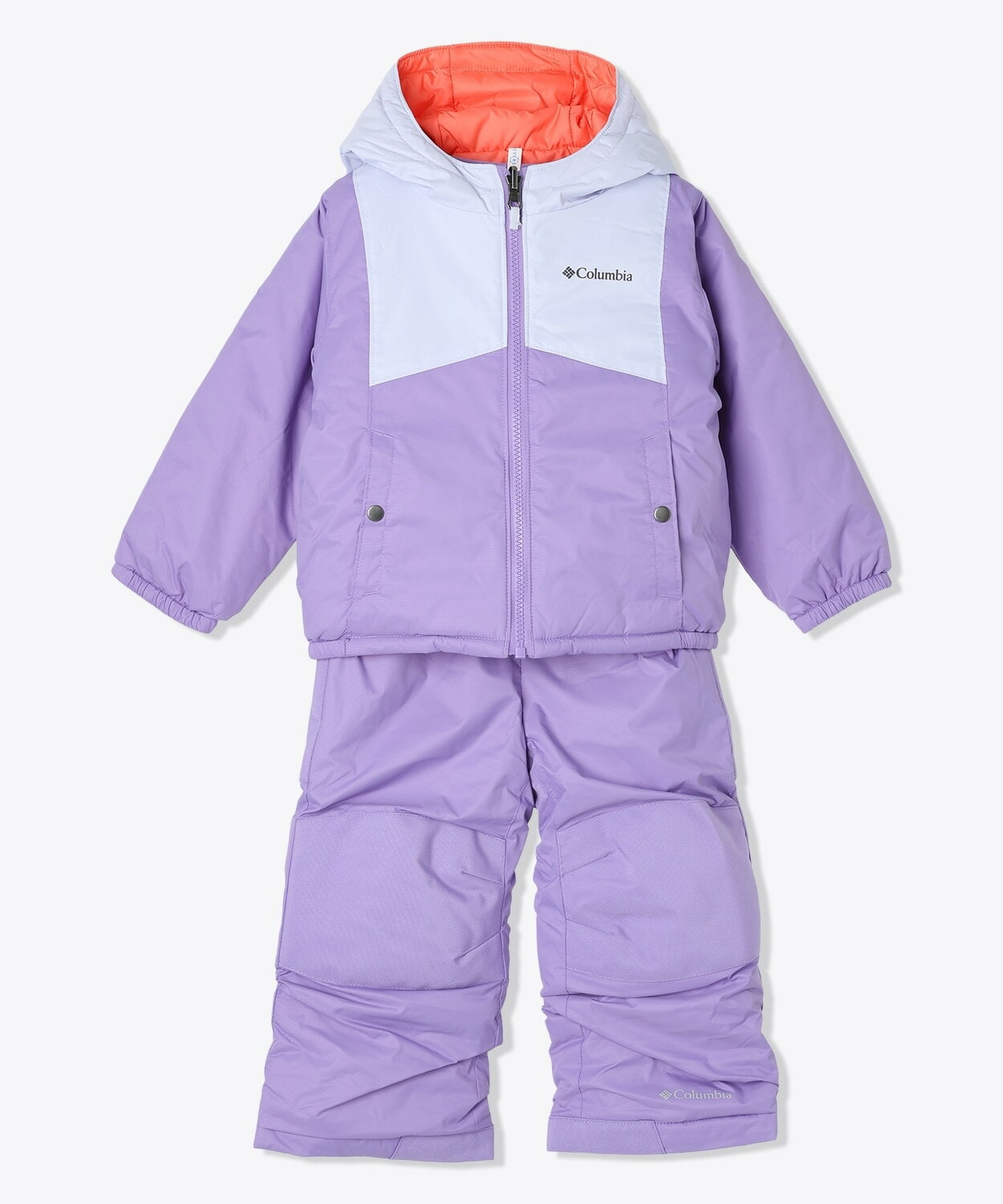 商品情報素材/材質ジャケット 表:ナイロンドビー(ナイロン100%) 裏:マットフェイスプレーンウィーブ(ポリエステル100%) 中わた:ポリエステル100% ビブ 表:ナイロンドビー(ナイロン100%) 裏:ナイロンタフタ(ナイロン100%) 中わた:リサイクルポリエステル85% ポリエステル15%サイズ/寸法100cm注意モニター発色の具合により色合いが異なる場合がございます。本製品は、夜間または光が鈍い場合の運転には適しておりません。Columbia コロンビア Double Flake Set ダブルFレイク セット ジュニアスキーウエア 上下セット SA5101-597 Paisley Purple, Snowdrift, Hot Coral リバーシブル ウィンタースポーツシーンに最適な中わた入りジャケット&ビブパンツセット ■サイズ:身長 3T 95~105cm XXS 105~120cm XS 120~130cm ■カラー:597 Paisley Purple, Snowdrift, Hot Coral防水素材を使用した、ビブパンツとジャケットのセットアイテム。両アイテムともに、防水加工を施したナイロン素材を採用。表面には、はっ水(撥水)機能「オムニシールド」を備えているため、予期せぬ雪や多少の雨にも対応します。また中わたを封入し、暖かな着心地を実現しました。裏面のキルト素材にも撥水加工を施しているので、用途に応じてリバーシブルで着用することができます。ビブパンツはサスペンダーを配置し、サイズ調整が可能です。裾の内側にレッグゲイターを備えているため、雪やみぞれの侵入を防ぎます。セット使いはもちろん、それぞれ単体でも着こなしを楽しむことができる万能アイテムです。【特徴】・コロンビア独自のはっ水(撥水)機能「オムニシールド」※ビブパンツ、ジャケット・ウォータープルーフファブリック※ビブパンツ、ジャケット表面・中わた入り※ビブパンツ、ジャケット・安全性を考慮したリフレクターディテール※ビブパンツ、ジャケット・ジャケットはリバーシブルタイプ・ジャケットはサイズ調整可能なストームフード・ビブパンツは調整可能なサスペンダー・ビブパンツは冷気や雪の侵入を防ぐレッグゲイター・セット使いや単体使いもおすすめ・ベタ雪以外のスノーシーズンにおすすめ 2