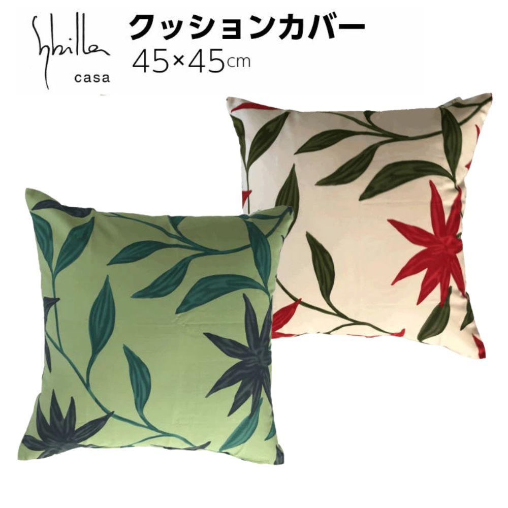 クッションカバー 正方形 45×45cm 綿100% 日本製 シビラ (sybilla)フローレス/グリーン ベージュ