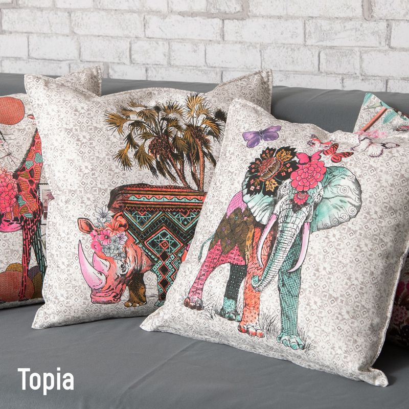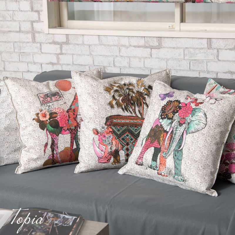 [P10倍 4日20時〜4時間+2000円OFFクーポン]クッションカバー 45×45cm かわいい ファスナー付き インテリア 友安製作所 YH803 トピアCU キリン ゾウ サイ 花 フラワー アジアン オーガニックコットン 綿100% C-F-1