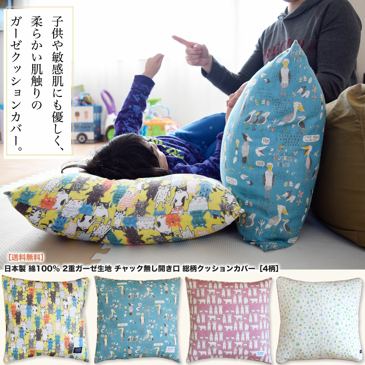 日本製 綿100% 2重 ガーゼ クッションカバー 45×45cm チャック無し 開き口 総柄 [4柄] 送料無料 北欧 おしゃれ ハシビロコウ 猫 ネコ ベビー ビーズクッション カバー 子供 動物 キャラクター 速乾 ねこ ネコ イエロー ブルー