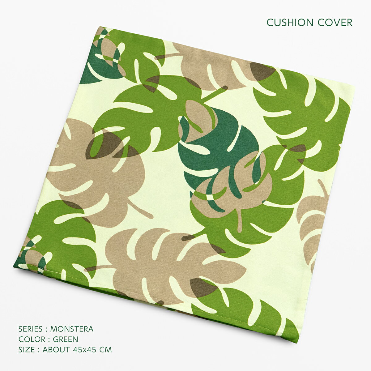 クッションカバー 約45×45cm モンステラ グリーン 綿100% 緑系 45角 背あて 日本製 植物 ボタニカル 花 フラワー セアテ 背当て 腰当て 腰あて ランバーサポート