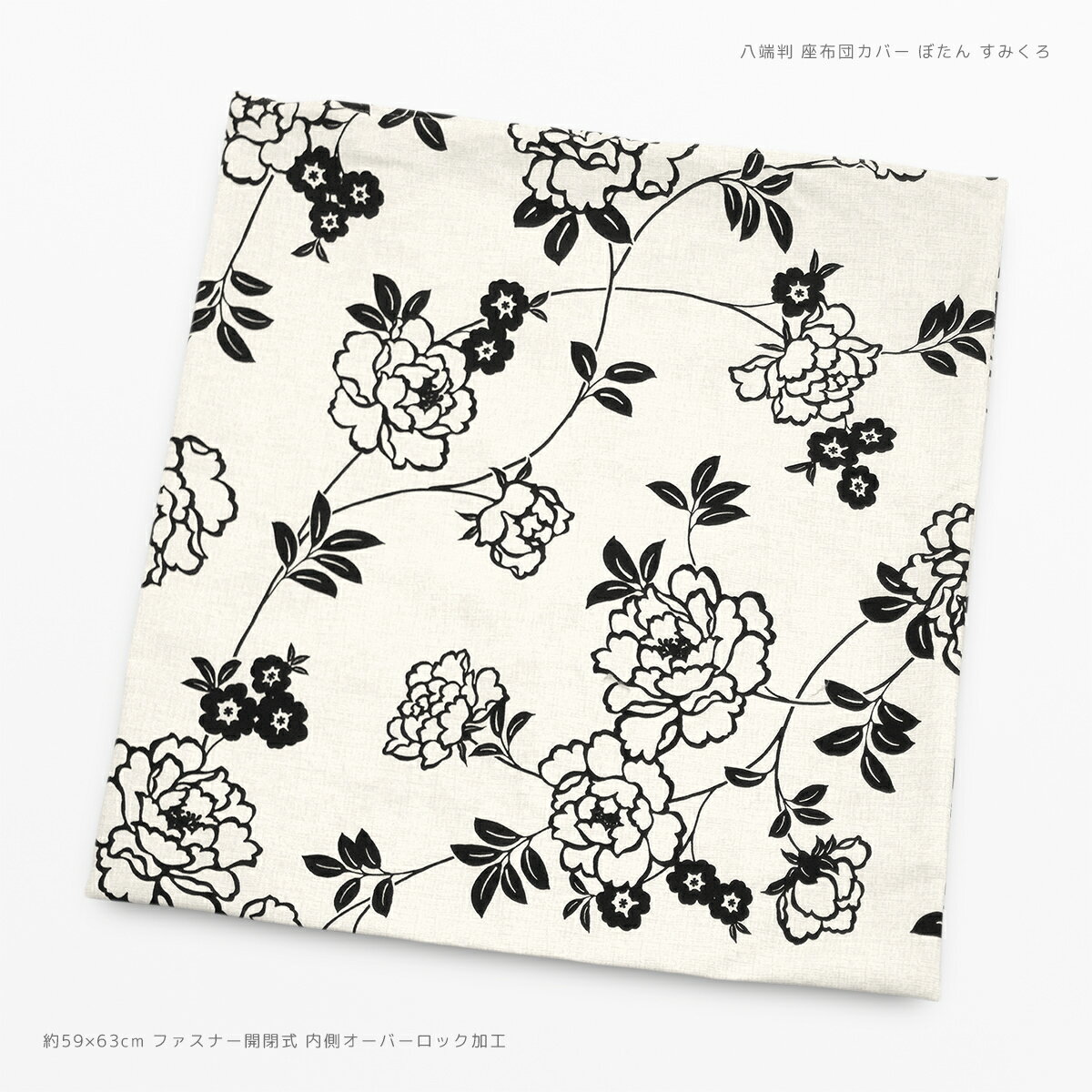 座布団カバー 約59×63cm 八端判 ぼたん すみくろ 綿100% ナチュラル 花 フラワー 植物 草花 ボタニカル 素縫い 両面共生地 ファスナー ざぶとん ザブトン 座ぶとん 座蒲団
