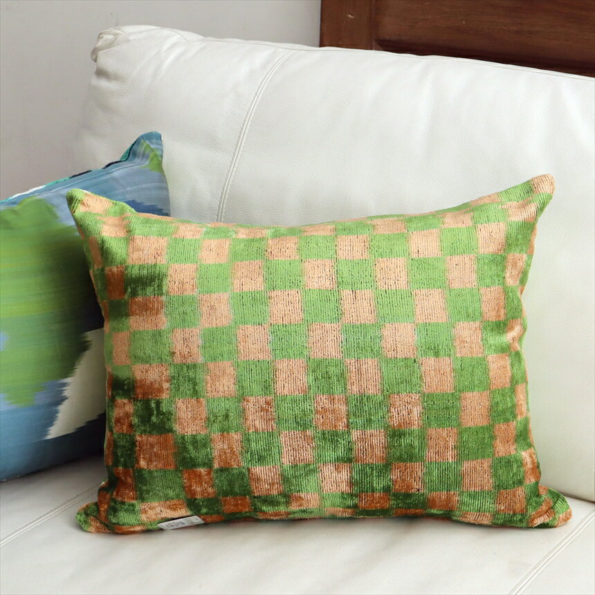 【15%OFFクーポン対象品】アトラス ベルベットイカットクッションカバー 両面シルク50×38cm市松模様 グリーンxハルダル Silk Velvet Cushion - Double-Sided Design