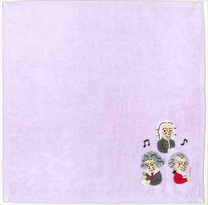 厚すぎず薄すぎないふっくらしたタオル地にバッハ、モーツァルト、ベートーヴェンの刺繍をあしらいました。[br/]普段使いにはもちろん、ちょっとしたプレゼント、発表会記念品におすすめです。[br/][br/]素材:綿100%[br/]サイズ:約250×250