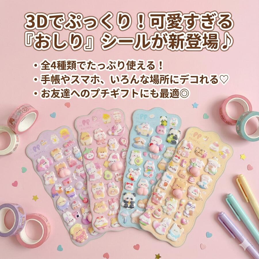 \大容量★1枚175円~!全4柄/ おしりシール もちもち お尻3Dシール おしり シール ぷにぷに 3D立体 シール 手帳 可愛いシール 飾り 3枚入 6枚入 9枚入 立体 ステッカー 3D ストレス 解消 かわいい 装飾 DIY用 癒し 手帳 装飾用 贈り物 子供 女の子 SNS人気 子供 大人