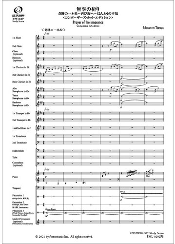 ジャンル:国内吹奏楽出版社:フォスターミュージック弊社に在庫がない場合の取り寄せ発送目安:1週間〜10日解説:2013年9月、東日本大震災から2年半が経とうとしていた東北を訪れました。実際に足を運んだことで、各地の景色を眺めては、どう言葉にしていいかわからないほどの現実を目の当たりにし、東北の今を肌で感じた数日でした。そして、そんな中でも、少しずつ少しずつ前に進もうとしている町の方々に出会い、深く考えさせられました。東北で過ごしたこの数日間で現地の方から伺ったお話や、さらに強く芽生えた復興の願いの気持ちを込めて、曲は「奇跡の一本松」「再び海へ」「ほんとうの幸福」の3つの印象で書かせていただきました。人々の心の拠りどころである「奇跡の一本松」過去の度重なる津波から高田の町を守ってきた、約7万本と言われる高田松原もほとんどが流されてしまいましたが、その中で唯一耐え残ったのが「奇跡の一本松」です。海を見つめ佇み、何かを語りかけているかのように見える一本松の様子を表しています。「再び海へ」漁が再開され、再び船に乗り海へ出ていく漁師さん達の勇ましい様子を表しています。「ほんとうの幸福」巨大地震、大津波、原発事故、風評被害という未曾有の複合災害が起きて、まだ3年。心から笑顔になれる日が一日でも早く訪れますようにと祈る気持ちを込めました。 『無辜』何も罪のない人々、街、ものが、深い傷を負い苦しい現実と戦いながらも、どうか少しでも早く癒されますように、明るい未来を願っています。(樽屋雅徳)この版は、2014年に出版された現行版(FML-0120)を元に、全日本吹奏楽コンクール小編成部門の編成と制限時間を基準に、オーケストレーションおよび構成を改訂したものです。Fl. 1 / doub. Picc. / Fl. 2 / Ob. (opt.)/ Bsn. (opt.)/ Bb Cl. 1 / Bb Cl. 2 / Bs.Cl. / A.Sax. / T.Sax. / B.Sax. / Trp. 1 / Trp. 2 / Hr. 1 / Hr. 2 / Trb. 1 / Trb. 2 / Euph. / Tuba / String Bs.(opt.)/ Timp. / Perc. 1 (W.Chime, Bongos(締太鼓), Sleigh Bells) / Perc. 2 (B.D.(和太鼓), Tri., Tamb.) / Perc. 3 (Ocean Drum, Sus.Cym.)/ Vib. (opt.)/ Glock. (opt.)/ Pf.こちらの商品は他店舗同時販売しているため在庫数は変動する場合がございます。10000円以上お買い上げで送料無料です。