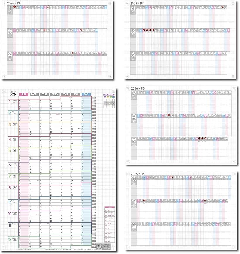 2026年(令和8年) 1月始まり。1年連結カレンダー・日曜始まり(1枚)と、進捗カレンダー(4枚)。1枚に3ヶ月分掲載。計5枚セット。3ヶ月~1年分の、夢や目標、スケジュールを俯瞰できるポスターカレンダーセット。進捗カレンダー。1枚で3ヶ月が見渡せる。A3サイズ。複数のタスク、プロジェクトの管理に。視覚化。1cmのグリッド(方眼)を好きな大きさで区切って書き込める。仕事や勉強の予定が重複しないように、工程全体を見える化。作業ごとのスケジュールがビジュアルでわかる。家族や、仕事の仲間など、複数人の予定を管理するのにも便利な。少し太めの線で区切って使用すると4人分だが、グリッドの区切り方次第で、5人、6人と人数が増えても使用できる。ガンチャート、家族カレンダー、家計簿など、、アイディア次第で色々な使い方ができる。レイアウト次第で3か月~1年を見渡せる、1年連結カレンダー。月曜始まり。1年を1枚で見れる。大きくて使いやすい、A2サイズ。シンプルだけど、あると便利な機能をたくさん集めた年間カレンダー。各月の境目は色違いの太線で区切り、年の切れ目は大きなタブで区切っているからわかりやすい。1日ごとの書き込みスペースをしっかりと確保。各月は数字だけでなく、英語、月の和名も掲載。ウィークナンバー付き。過去5年分の西暦和暦早見表つきで、西暦・令和・平成、そして干支も分かる。主な年間行事一覧付き。祝日ではないけれど、覚えておきたい行事を掲載。母の日や、父の日、イースター等、年によって日にちが違う行事や、十五夜、十三夜、夏至、冬至などの四季を感じられる行事も。また、月の数字の下にもフリースペースを確保。1年連結カレンダー、進捗カレンダーともに、周りにもグリッドが配置されているので、書き込み自由なフリースペースとして利用できる。書き込みスペースには、方眼を採用。文字の大きさや位置の目安に。まだ日にちが決まっていない行事や、TO DO LIST、夢、目標など、忘れてはいけないことは、このフリースペースへ。カレンダー部材がない。レイアウト自由なポスター形式鉛筆でもかける。書き込みやすい素材のカレンダーセット。年間スケジュールがたてやすい、年間行事予定、イヤープランナーとしても。パステルカラー基調のおしゃれな色合い。四隅に幾何学模様をデザイン。洗練された雰囲気に。ピンを刺す目印にも。※ 他ネットショップでも併売しているため、ご注文後に在庫切れとなる場合があります。予めご了承ください。※ 品薄または希少等の理由により、参考価格よりも高い価格で販売されている場合があります。ご注文の際には必ず販売価格をご確認ください。※ 沖縄県、離島または一部地域の場合、別途送料の負担をお願いする場合があります。予めご了承ください。※ お使いのモニタにより写真の色が実際の商品の色と異なる場合や、イメージに差異が生じることがあります。予めご了承ください。※ 商品の詳細(カラー・数量・サイズ 等)については、ページ内の商品説明をご確認のうえ、ご注文ください。※ モバイル版・スマホ版ページでは、お使いの端末によっては一部の情報が表示されないことがあります。すべての記載情報をご確認するには、PC版ページをご覧ください。