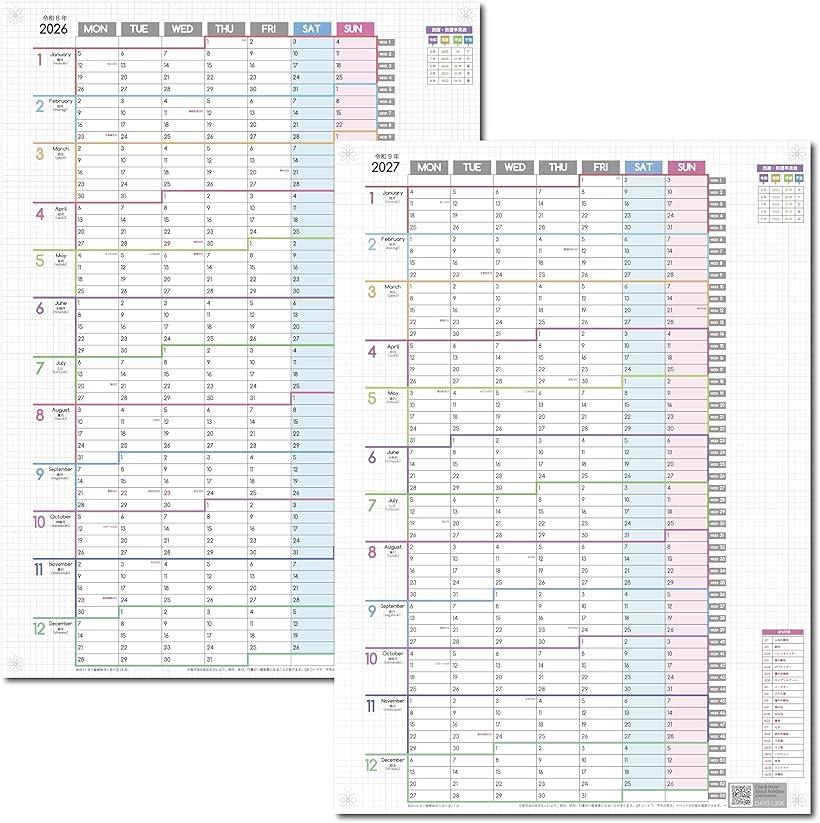 1年連結カレンダー。2026年と2027年の2年分、2枚セット。ともに1月始まり 月曜始まり。1年を1枚で見れる。大きくて使いやすいA2サイズ。シンプルだけど、あると便利な機能をたくさん集めた年間カレンダー。各月の境目は色違いの太線で区切ってあるのでわかりやすい。年の切れ目は大きなタブで区切っているからわかりやすい。カレンダー両脇に書き込み自由なフリースペースを確保。各月は数字だけでなく、英語、月の和名も掲載。また、月の数字の下にもフリースペースを確保。年間スケジュールがたてやすい、ウィークナンバー付き。年間行事予定表としても使いやすい。過去5年分の西暦和暦早見表つきで、西暦・令和・平成、そして干支も分かる。主な年間行事一覧付き。祝日ではないけれど、覚えておきたい行事を掲載。母の日や、父の日、イースター等、年によって日にちが違う行事や、十五夜、十三夜、夏至、冬至などの四季を感じられる行事も。四隅に幾何学模様をデザイン。洗練された雰囲気に。ピンを刺す目印にも。その年度の祝日の日数がわかる。カレンダー下部に祝日総数を掲載。2年分だから、急な祝日変更も考慮し、変更や、紙面に掲載されていないイベントなどをチェックできるQRコードを掲載。※ 他ネットショップでも併売しているため、ご注文後に在庫切れとなる場合があります。予めご了承ください。※ 品薄または希少等の理由により、参考価格よりも高い価格で販売されている場合があります。ご注文の際には必ず販売価格をご確認ください。※ 沖縄県、離島または一部地域の場合、別途送料の負担をお願いする場合があります。予めご了承ください。※ お使いのモニタにより写真の色が実際の商品の色と異なる場合や、イメージに差異が生じることがあります。予めご了承ください。※ 商品の詳細(カラー・数量・サイズ 等)については、ページ内の商品説明をご確認のうえ、ご注文ください。※ モバイル版・スマホ版ページでは、お使いの端末によっては一部の情報が表示されないことがあります。すべての記載情報をご確認するには、PC版ページをご覧ください。