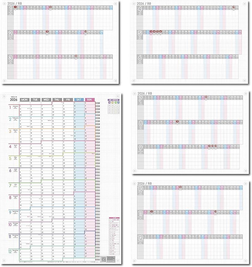 2026年(令和8年) 1月始まり。1年連結カレンダー・月曜始まり(1枚)と、進捗カレンダー(4枚)。1枚に3ヶ月分掲載。計5枚セット。3ヶ月~1年分の、夢や目標、スケジュールを俯瞰できるポスターカレンダーセット。進捗カレンダー。1枚で3ヶ月が見渡せる。A3サイズ。複数のタスク、プロジェクトの管理に。視覚化。1cmのグリッド(方眼)を好きな大きさで区切って書き込める。仕事や勉強の予定が重複しないように、工程全体を見える化。作業ごとのスケジュールがビジュアルでわかる。家族や、仕事の仲間など、複数人の予定を管理するのにも便利な。少し太めの線で区切って使用すると4人分だが、グリッドの区切り方次第で、5人、6人と人数が増えても使用できる。ガンチャート、家族カレンダー、家計簿など、、アイディア次第で色々な使い方ができる。レイアウト次第で3か月~1年を見渡せる、1年連結カレンダー。月曜始まり。1年を1枚で見れる。大きくて使いやすい、A2サイズ。シンプルだけど、あると便利な機能をたくさん集めた年間カレンダー。各月の境目は色違いの太線で区切り、年の切れ目は大きなタブで区切っているからわかりやすい。1日ごとの書き込みスペースをしっかりと確保。各月は数字だけでなく、英語、月の和名も掲載。ウィークナンバー付き。過去5年分の西暦和暦早見表つきで、西暦・令和・平成、そして干支も分かる。主な年間行事一覧付き。祝日ではないけれど、覚えておきたい行事を掲載。母の日や、父の日、イースター等、年によって日にちが違う行事や、十五夜、十三夜、夏至、冬至などの四季を感じられる行事も。また、月の数字の下にもフリースペースを確保。1年連結カレンダー、進捗カレンダーともに、周りにもグリッドが配置されているので、書き込み自由なフリースペースとして利用できる。書き込みスペースには、方眼を採用。文字の大きさや位置の目安に。まだ日にちが決まっていない行事や、TO DO LIST、夢、目標など、忘れてはいけないことは、このフリースペースへ。カレンダー部材がない。レイアウト自由なポスター形式鉛筆でもかける。書き込みやすい素材のカレンダーセット。年間スケジュールがたてやすい、年間行事予定、イヤープランナーとしても。パステルカラー基調のおしゃれな色合い。四隅に幾何学模様をデザイン。洗練された雰囲気に。ピンを刺す目印にも。※ 他ネットショップでも併売しているため、ご注文後に在庫切れとなる場合があります。予めご了承ください。※ 品薄または希少等の理由により、参考価格よりも高い価格で販売されている場合があります。ご注文の際には必ず販売価格をご確認ください。※ 沖縄県、離島または一部地域の場合、別途送料の負担をお願いする場合があります。予めご了承ください。※ お使いのモニタにより写真の色が実際の商品の色と異なる場合や、イメージに差異が生じることがあります。予めご了承ください。※ 商品の詳細(カラー・数量・サイズ 等)については、ページ内の商品説明をご確認のうえ、ご注文ください。※ モバイル版・スマホ版ページでは、お使いの端末によっては一部の情報が表示されないことがあります。すべての記載情報をご確認するには、PC版ページをご覧ください。