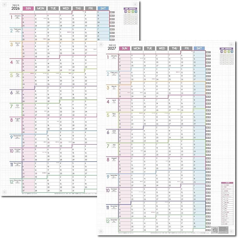 1年連結カレンダー ポスター 2年分のカレンダー A2標準サイズ 2026年 2027年 1月始まり 日曜始まり 大きい 壁掛け 令和8年 1Y-2627-01S (パステル, 標準(A2サイズ))