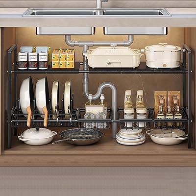 キッチンシンク下収納, 洗面台下収納 キッチン収納ラック 伸縮式, 2段収納 キッチン収納ラック 組み立て簡単 省スペース 収納バスケット2個付き, W 53-88 x D 25 x H 48.5 cm. (仕切り4枚+バスケット2個+ポットホルダー