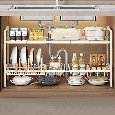 シンク下収納ラック, 洗面台下収納 キッチン収納ラック 洗面台下収納 キッチン収納ラック 伸縮式, 2段収納 キッチン収納ラック 組み立て簡単 省スペース 収納バスケット3個付き(仕切り5枚+バスケット3個+ポットホルダー1個) (ホワイト)