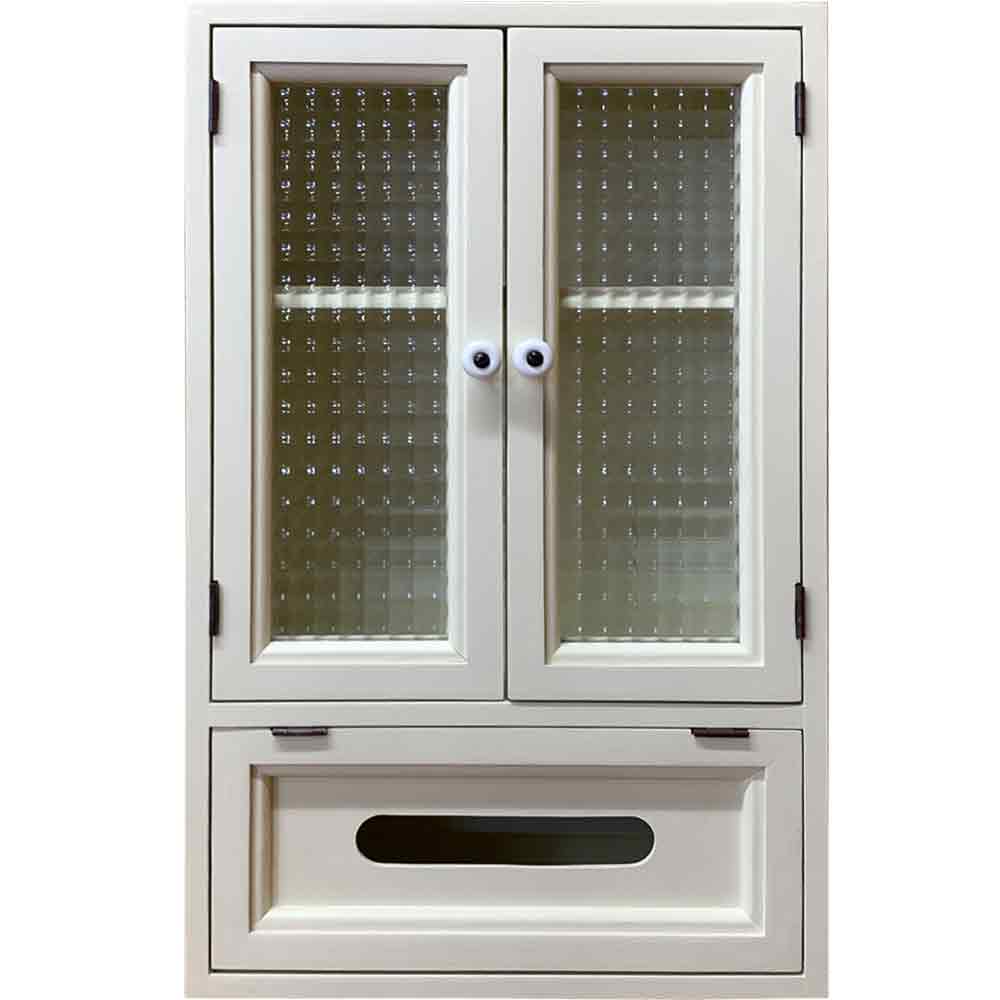 キャビネット アンティークホワイト 31×13×50cm ティッシュボックス チェッカーガラス扉 木製 ひのき ハンドメイド オーダーメイド