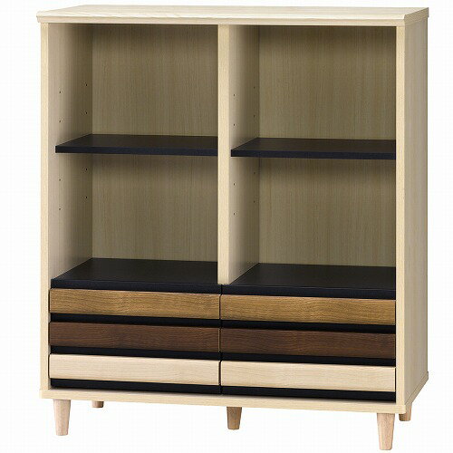 引き出しの3色デザインが特徴的なデザイン家具 ●引き出しの3色デザインが特徴的なデザイン家具。 ●天然木のような風合いのシートを採用。 ●引き出し部スライドレールで開け閉めらくらく。 ●商品サイズ:幅790x奥行408x高さ915mm。 ●商品重量:34kg。 ●天板耐荷重:20kg、棚板耐荷重:10kg。引き出し耐荷重:5kg ●組立式。組立の目安:60分程度。 ●マレーシア製。 ●素材:プリント紙化粧繊維板。