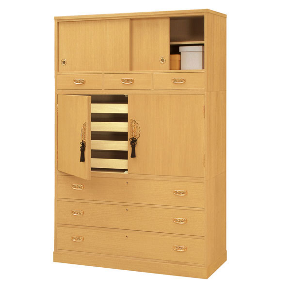 商品説明 サイズ(cm) 本体:幅100×奥行44×高さ177 盆内寸:幅92×奥行36×高さ4.5 小引出し内寸:幅25.5×奥行37.6×高さ15 大引出し内寸:幅90.2×奥行37.6×高さ15 仕様 材質:桐 時代仕上げ カキ板厚23mm 重厚な金具取手 着物32枚収納可能(タトウ紙の厚さを約3cmで換算) 国産 完成品 送料 送料無料ただし、北海道、沖縄、離島は追加料金がかかります。お気軽にお問合せ下さい。 備 考 ※この商品の夜間配達はお受けできません、日曜・祝日をご希望の場合にはご相談下さい。 ※配送は全て宅配便(1人)での玄関渡しとなります。大型商品や重量商品、エレベーターの無い2階以上にお住まいのお客様は、玄関口までの搬入をお手伝いをお願いしております事をご了承ください。 時代仕上げ木地を焦がした後に塗装する仕上げの方法。これによって、木目が際立ちます。 他の仕上げ方法に比べて汚れがつきにくく、色の変色が少ない。
