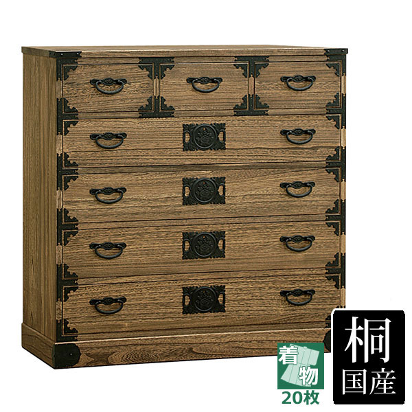 商品説明 サイズ(cm) 本体:幅100×奥行44×高さ101 小引出し内寸:幅25.5×奥行37.6×高さ15 大引出し内寸:幅90.2×奥行37.6×高さ15 仕様 材質:桐 時代仕上げ カキ板厚23mm 重厚な金具取手 着物20枚収納可能(タトウ紙の厚さを約3cmで換算) 国産 完成品 送料 送料無料ただし、北海道、沖縄、離島は追加料金がかかります。お気軽にお問合せ下さい。 備 考 ※この商品の夜間配達はお受けできません、日曜・祝日をご希望の場合にはご相談下さい。 ※配送は全て宅配便(1人)での玄関渡しとなります。大型商品や重量商品、エレベーターの無い2階以上にお住まいのお客様は、玄関口までの搬入をお手伝いをお願いしております事をご了承ください。 時代仕上げ木地を焦がした後に塗装する仕上げの方法。これによって、木目が際立ちます。 他の仕上げ方法に比べて汚れがつきにくく、色の変色が少ない。