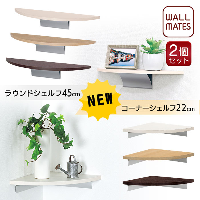 ウォールメイツ正規品【お得な2個セット ラウンドシェルフ45cm ・コーナーシェルフ22cm 】3色(アイボリー・ナチュラル・セピア)から選べる 賃貸OK 石膏ボード 壁 に ピン 取り付け 日本製 玄関・トイレ、おしゃれ な 木目調(北欧・木製・白)ウォールラック