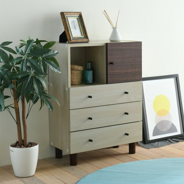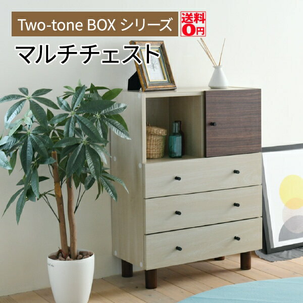 ●【メーカー直送品】メーカー在庫欠品の場合は、次回入荷までお時間を頂く場合がございます ■商品説明 木目のあるナチュラル×ダークブラウンのツートーンで、ちょっぴりレトロな大人可愛いマルチチェスト。3段の引き出しには小物や雑貨を収納したり、ハンカチなどの衣類を収納しても◎引き出しの上部にはオープン、扉付きの収納もご用意。「見せる収納」「隠す収納」どちらも使用できるデザインです。同じシリーズ商品と自由に組み合わせることで、お部屋に合わせたレイアウトとオリジナル収納を実現できます。■本体サイズ[外寸]幅60×奥行32.5×高さ85cm■その他サイズ[内寸] (オープン部)幅27×奥行26.5×高さ27.5cm (扉内)幅25.5×奥行26.5×高さ27.5cm (引き出し)幅51.5×奥行23×高さ7(有効内寸:上段8.5、中段10.5、下段11)cm■材質[本体]プリント紙化粧合板■収納量・耐荷重[天板]約10kg以下 [扉内]約5kg以下 [オープン部]約5kg以下 [引き出し]各約7kg以下■備考・扉左右入れ替え可能■生産国中国■組立時間(目安)(大人2人)お客様組立(45分)■キーワードおしゃれ 服 リビング オシャレ 脚付き 薄型 薄い キャビネット スリム 整理ダンス タンス 茶色 ナチュラル 引き出し 低め 木目 ロータイプ 和モダン 電話台 ベージュ ベッドルーム 3段 衣類収納 衣装 小物収納 引き出し付き 木目調 ラック付き ワンルーム ディスプレイ付き 北欧風 サイドボード ソファ横 洋服タンス ローチェスト オープンラック 収納ラック 飾り棚 リビングキャビネット ライトブラウン ディスプレイラック【送料無料】 組み合わせ自由! 2tone Box シリーズ マルチチェスト (幅60cm) 「こちらの商品は送料0円です」 北海道も送料無料 ※沖縄県・離島部ならびに一部山間部・僻地への配送はお伺いする事が出来ません。