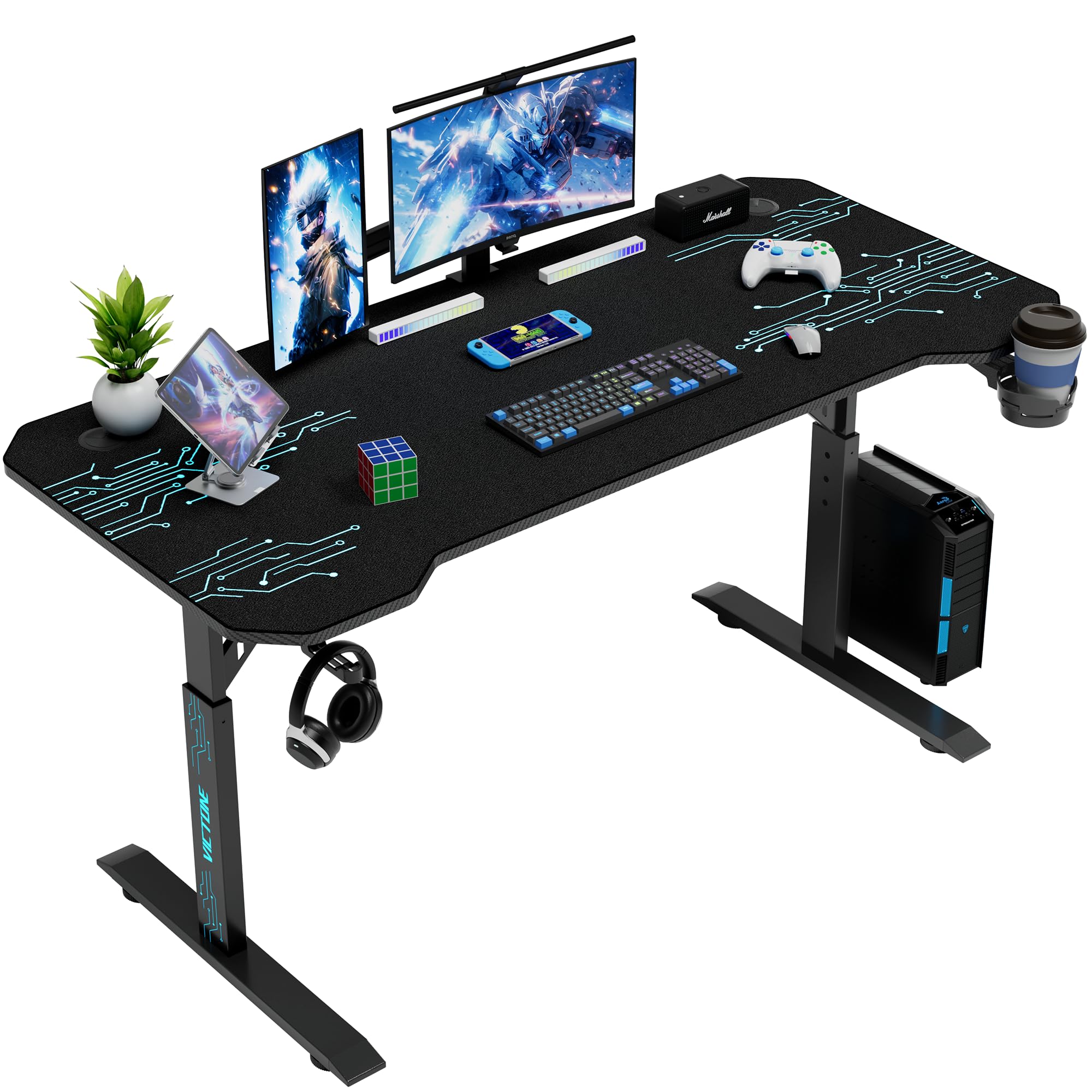 ゲーミングデスク パソコンデスク 幅140*奥行60*高さ56/71/75/79cm 4段階高度調整可能 超大型マウスパッド ゲームデスク PCデスク机 炭素繊維天板 ワークデスク 作業机 カップホルダー ヘッドホンホルダー ブラック