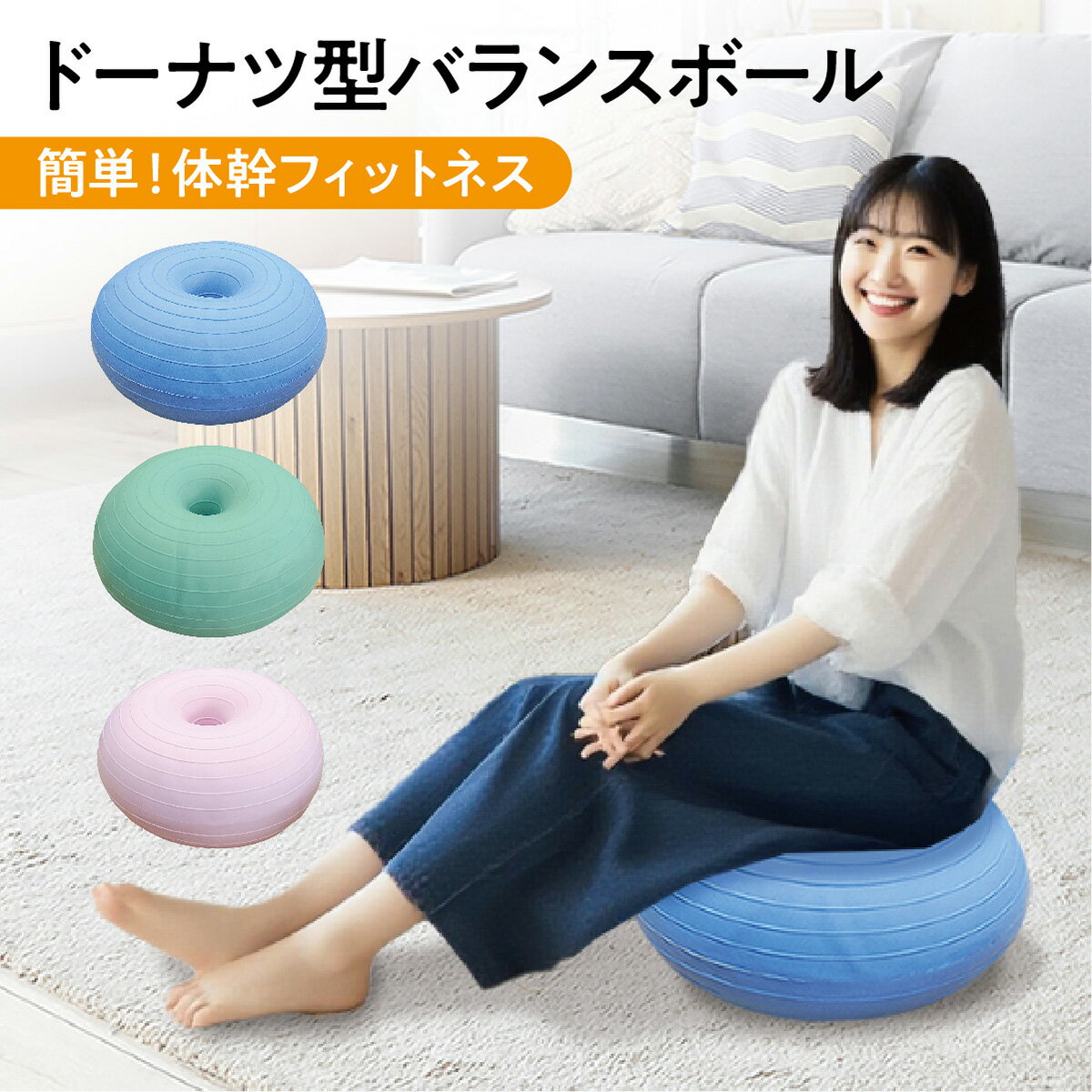 ドーナツ型バランスボールクッションのように乗るだけで、簡単に体幹フィットネスができる球体型バランスボールに比べ、平らな面が大きく、中心部の凹みによって重心が分散しやすい設計になっており、安心して運動できる!球体型のバランスボールよりバランスが取りやすく高さも低いので転倒リスクが大幅軽減!バランスを取ることで気がつけば、背筋が伸び、美しい姿勢に改善されます◇おすすめ商品ラインナップ◇ - フィットネス商品 - オシャレな雑貨のサイトはこちらから