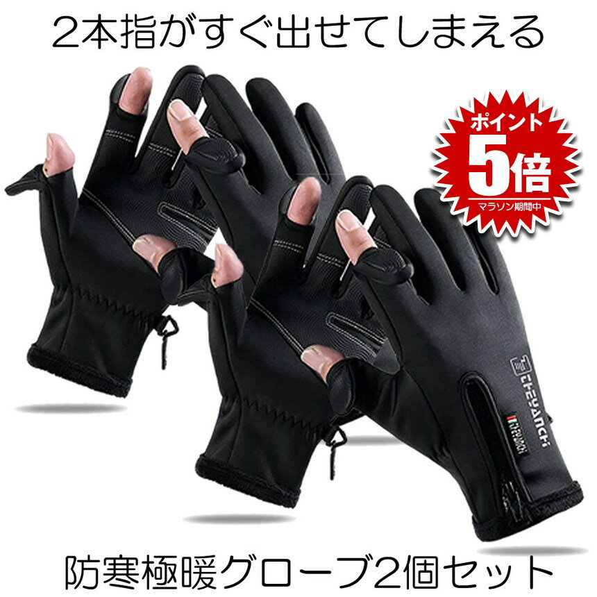 【送料無料】 アウトドアグローブ 2個セット スマホ 手袋 防寒グローブ スポーツグローブ タッチパネル スマホ対応 手ぶくろ 防風 防水 2本 指だし 裏起毛 滑り止め HOYUBI