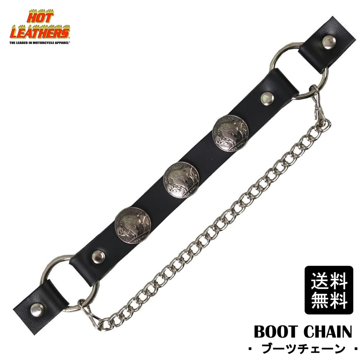 米国直輸入! HOTLEATHERS [Buffalo Nickel Boot Chain] ホットレザー バッファローニッケル ブーツチェーン! いつものブーツを新デザインに! バイカーズ アクセサリー Designed in the USA シルバーカラー コンチョ メダリオン ブラックレザーストラップ