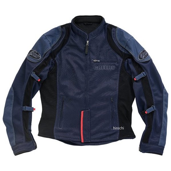グリーディー GREEDY 春夏モデル スポーツメッシュジャケットサイズ:Lカラー:ネイビー標準装備プロテクター:肩、肘、背、胸※RS-TAICHI社製プロテクター(別売)装着可能。【素材】表地:ポリエステルメッシュ、ナイロン、2wayストレッチ裏地:ポリエステルメッシュ【仕様説明】動きやすさを追求したスポーツスタイルのメッシュジャケットです。乗車時の快適性を重視したライディング重視モデルです。頚椎部分に5mm厚のウレタンパッド内蔵で転倒時のダメージを軽減。脇2WAYニットを肩口にシャーリングを部分採用。腕の可動とコーナー時のポジションをスムーズにします。上腕、肘下部分の2箇所にバタつき防止フラップを採用しライディング時のフィット感を向上。GRGNS051NVL楽天 JP店