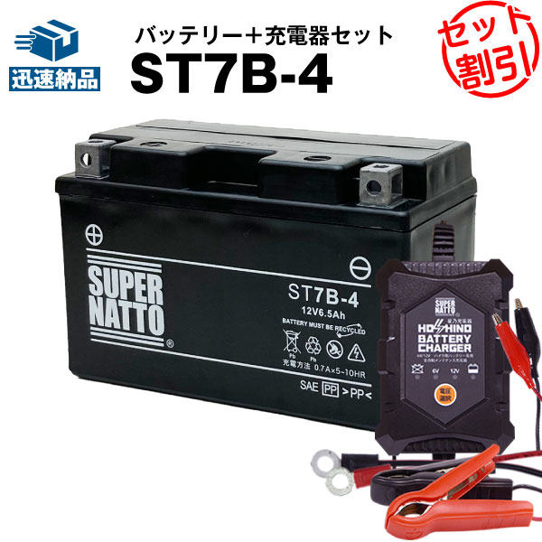 【マラソン限定★エントリーでP10倍】バイクバッテリー充電器+ST7B-4 セット■バイクバッテリー■GT7B-4 FT7B-4 12V7B-Bに互換■12V/6V切替 星乃充電器・スーパーナット【送料無料】【特別割引】シグナスX、TT250R、YP250、マジェスティ、DR-Z400S 他【新品】