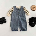 |  ベビー服 春秋 おしゃれ 韓国風 デニム サロペット ロンパース セットアップ 男女兼用 ストライプ柄 トップス付き コットン素材