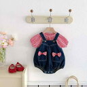|  ベビー服 女の子 かわいい チェック柄 リボン デニム サロペット オーバーオール ノースリーブ ロンパース コットンブレンド 春夏 2点セット 赤ちゃん 新生児用 韓国風 おしゃれ